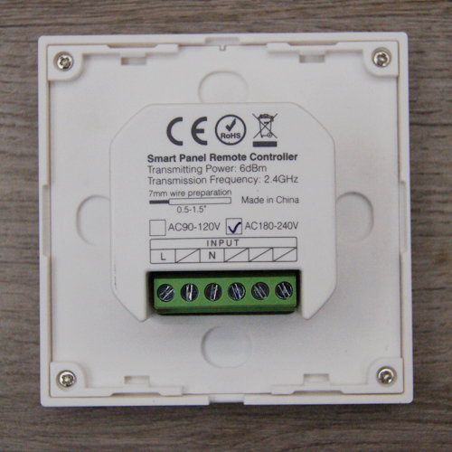 Ce contrôleur tactile mural de couleur blanche s'encastre directement dans le mur, à la place d'un interrupteur classique, à l'aide d'un pot d'encastrement carré de dimensions 86 x 86 x 40 mm.