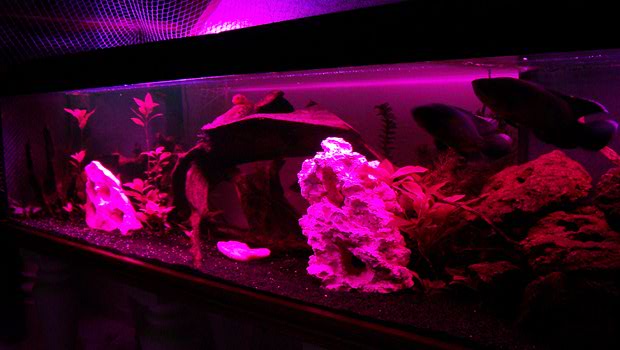 Pour cet aquarium de 600 litres, 2 rubans RGB de 1.55 mètres ont été collés au silicone sur le couvercle de l'aquarium.